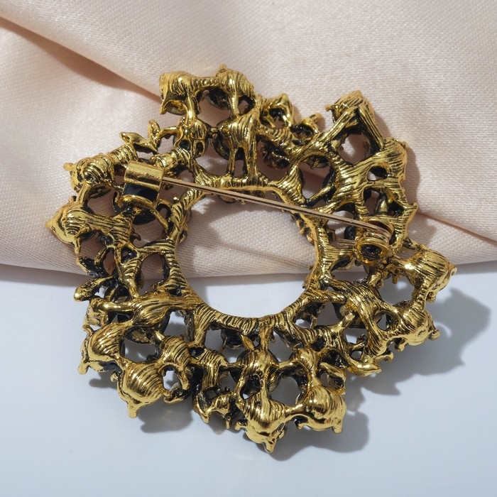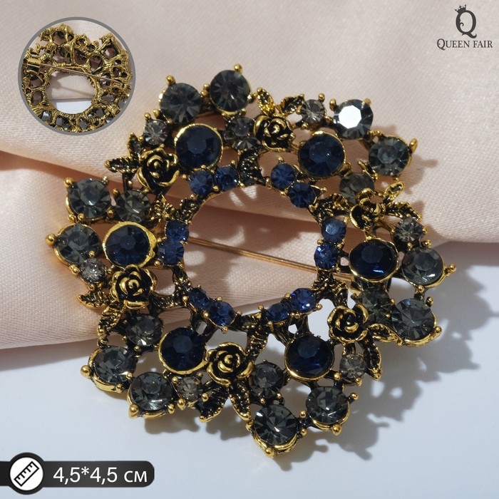 Брошь «Императрица» круг с розами, цвет серо-синий в чернёном золоте