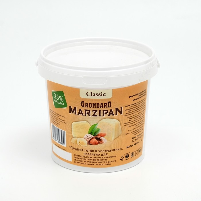 Большой, сладкий и необычный подарок для детей и взрослых. Целый килограмм свежего марципана в ведерке! Обладает ярко выраженной ореховой текстурой и настоящим ароматом миндаля. Марципановая масса оптимальна для кондитерских продуктов: начинок, покрытия и слоев, тортов, конфет и где необходимо снизить сладость продукта. За счёт высокой доли миндаля 33% сохраняет все полезные свойства ореха. Приятный, не приторный вкус - прекрасно сочетается с несладким чаем и кофе.