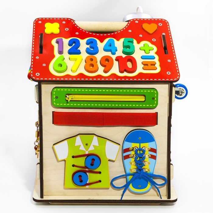- Многофункциональность: на стенах бизидома вы увидите разнообразные лабиринты, колесики, шестеренки, циферблат со стрелками, колокольчик, дверцы с разнообразными замками, молнии и шнуровки. На крыше дома вы увидите сортер с разноцветными цифрами и геометрическими фигурами, розетку и светильник.