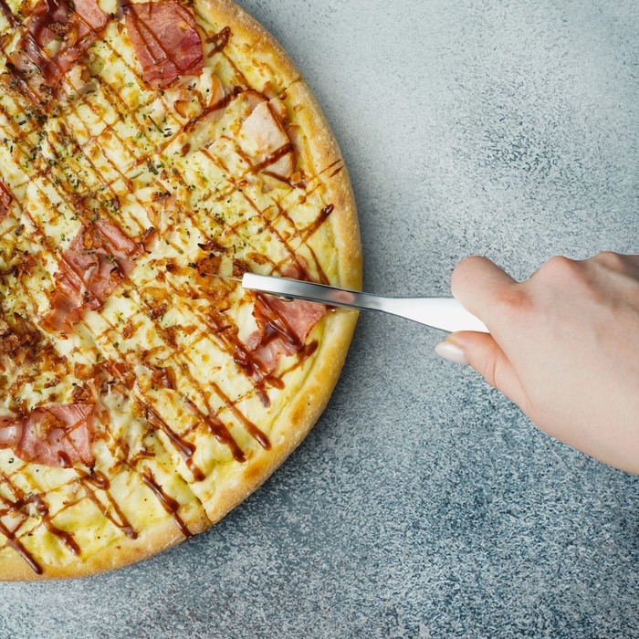 Нож для пиццы — универсальный кухонный инструмент, который не только легко разрезает готовую выпечку, но и помогает поделить на слайсы липкое тесто. Нож имеет эргономичную форму ручки и острое круглое лезвие. Колесо, прикреплённое к рукояти, продавливает продукт, а не разрезает его в отличие от классического ножа. Благодаря такому способу тесто разрезается, а начинка остается на месте.