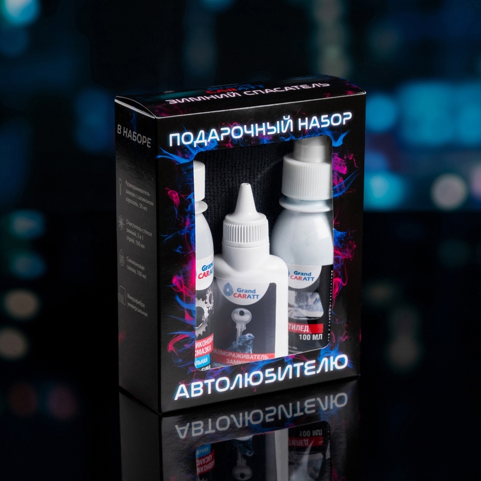 Подарочный набор автолюбителю Grand Caratt black, Зимний спасатель: размораживатель замков 50 мл, Антилёд 100 мл, силиконовая смазка 100 мл, микрофибра