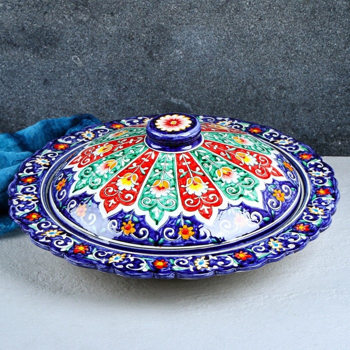 Блинница Риштанская Керамика "Цветы", 37 см, под крышкой 28 см, синий