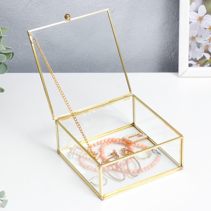 Шкатулка стекло с металлическим каркасом "Квадрат с гранями" золото 5х12х12 см