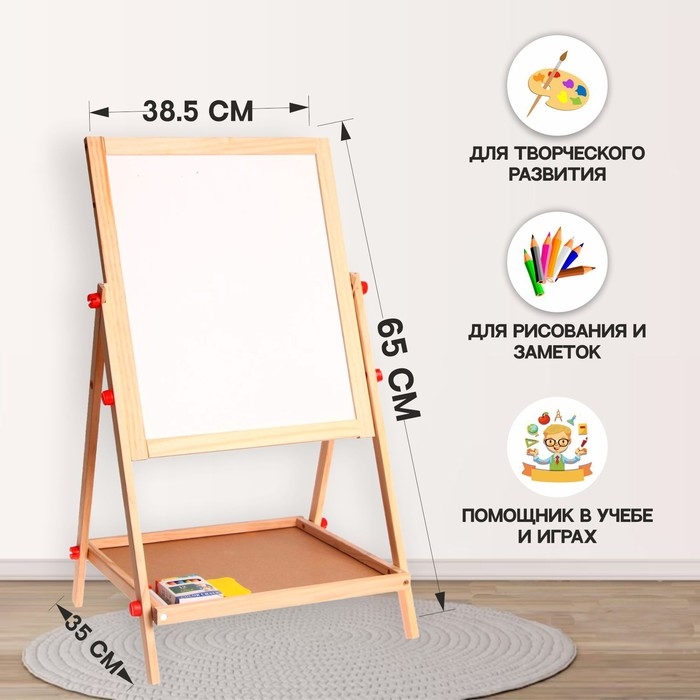 Доска на ножках станет незаменимым помощником как дома, так и в детском саду или развивающей группе. Изучайте буквы и цифры, решайте первые математические примеры, рисуйте шедевры — и всё это на красочной и многофункциональной доске.