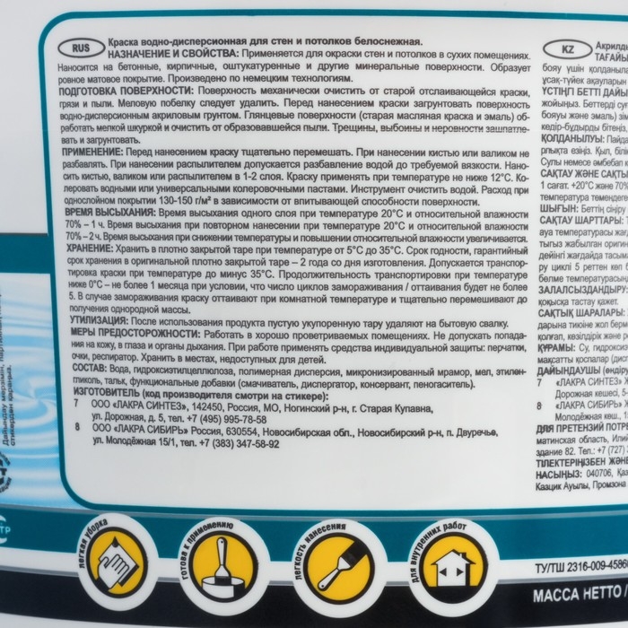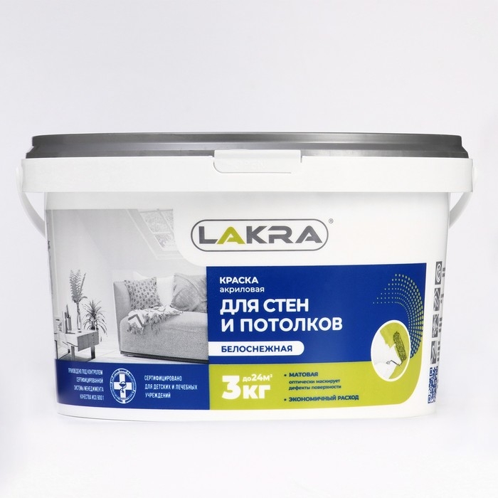 Краска водно-дисперсионная ЛАКРА для стен и потолков белоснежная 3кг