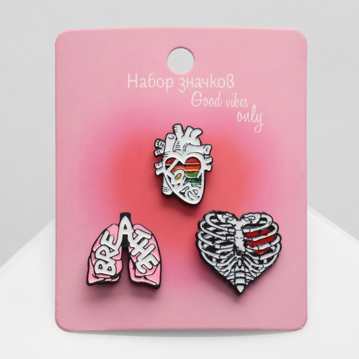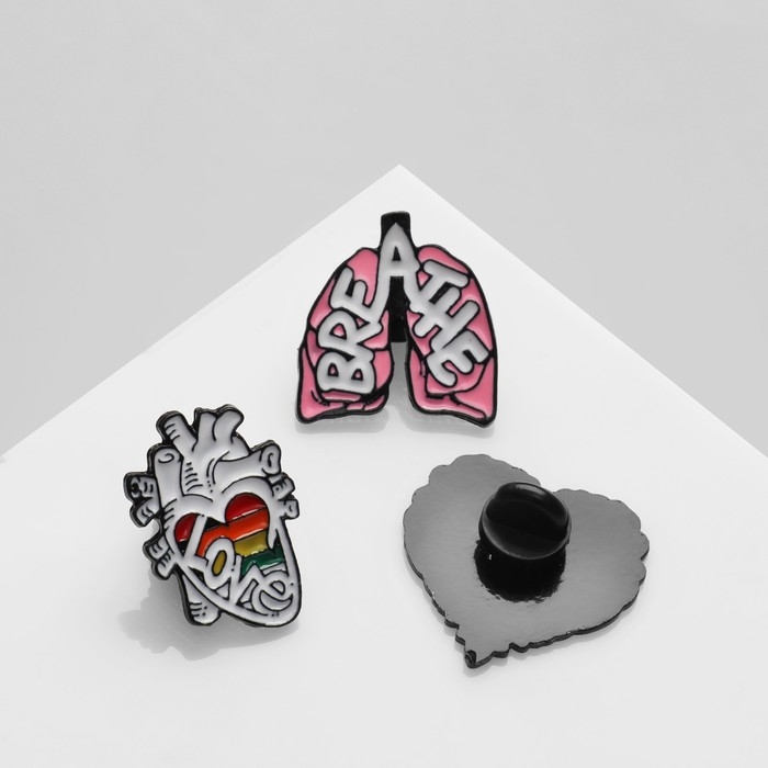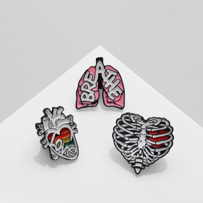 Набор значков (3 шт.) «Органы» лёгкие, сердце, грудная клетка, цветной в чёрном металле