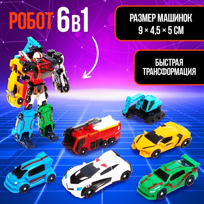 Из глубин космоса по заоблачным маршрутам на нашу планету прибыл невероятный гость — «Мегаробот». Главная особенность — в случае опасности этот робот способен разделиться на 6 уникальных машинок!