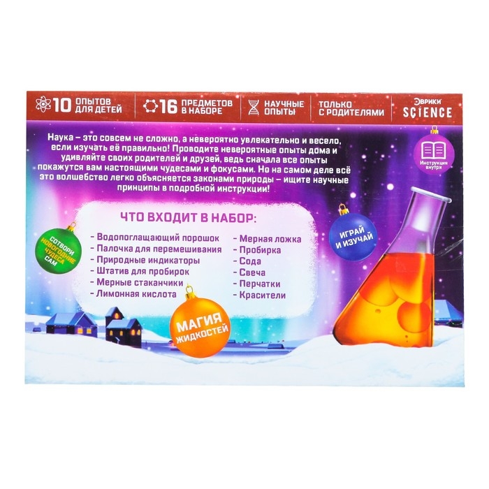 Набор для опытов «Новогодние истории» — то, что нужно для полезного и интересного досуга! Такой подарок поможет ребёнку скрасить ожидание Нового года, а также позволит провести 10 увлекательных опытов.