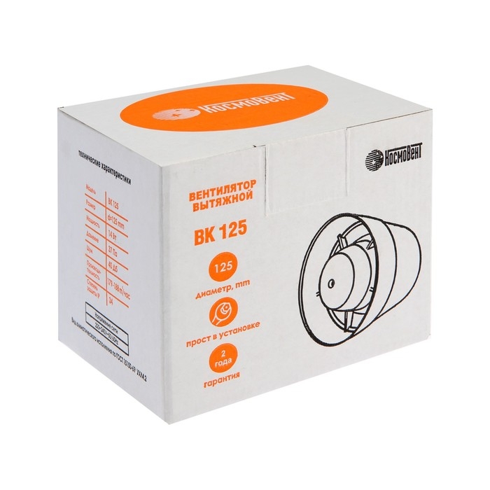 Вентилятор вытяжной "КосмоВент" ВК125, d=125 мм, 12 Вт, 40 дБ, 188 м³/ч, канальный