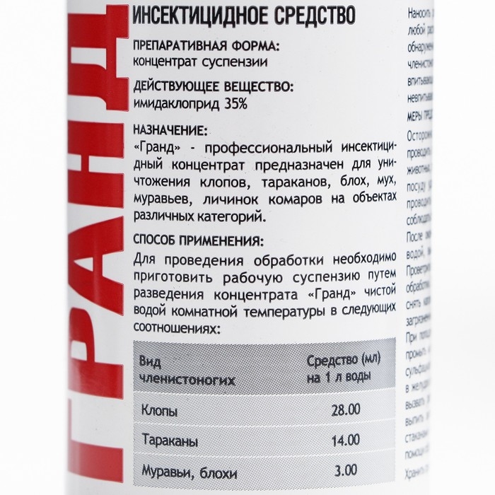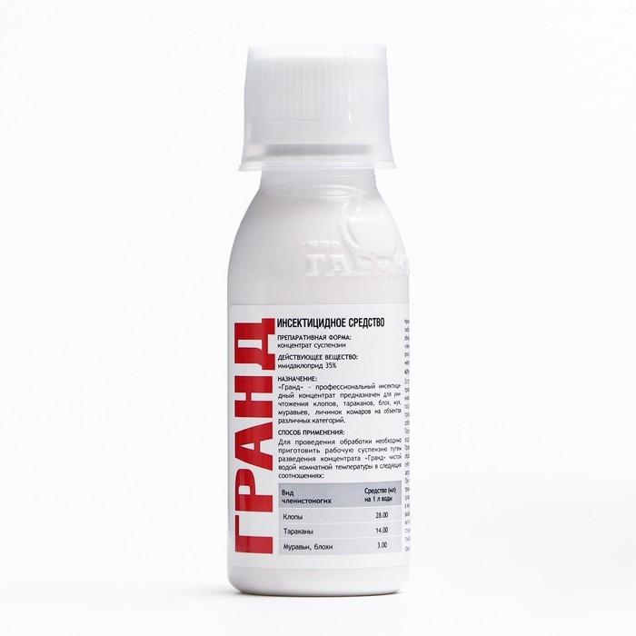 Профессиональный инсектицидный концентрат «Гранд» предназначен для уничтожения тараканов, клопов, мух, блох, муравьев, личинок комаров на объектах различных категорий.