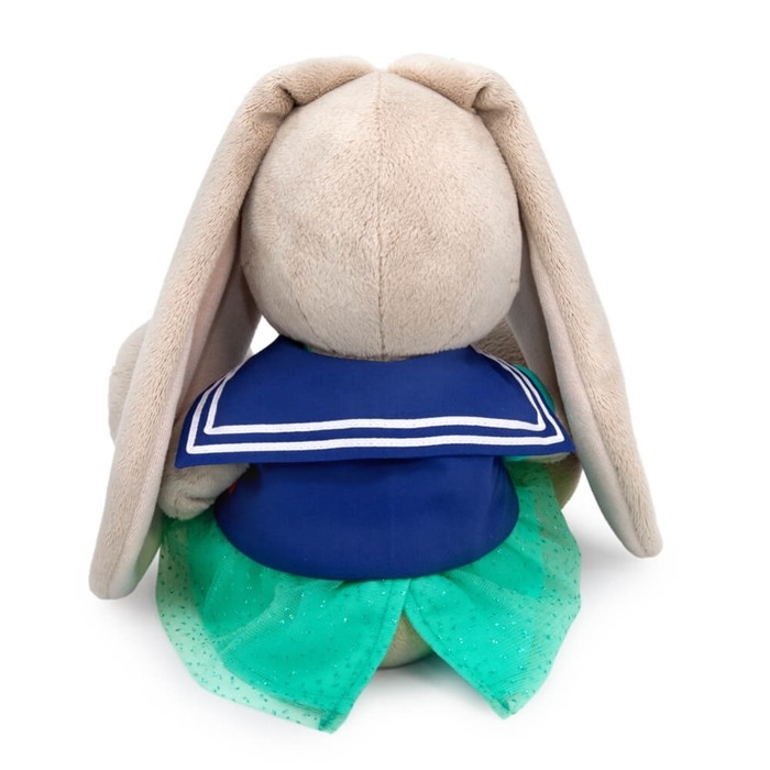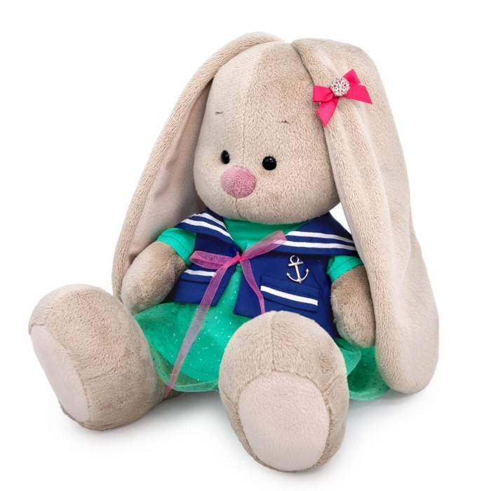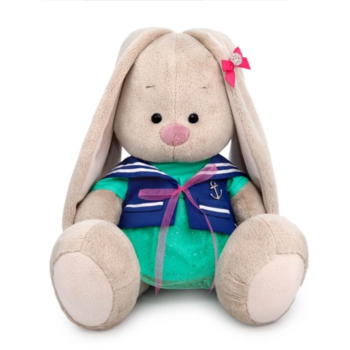 - На зайке платье благородного бермудского цвета из плотной ткани с нашитой от талии бирюзовой сеточкой и жилет из костюмной ткани ослепительного синего цвета с отложным морским воротником. Жилетик завязывается на капроновую сиреневую ленту и украшен серебристым якорем. На ушке розовый бант из репсовой ленты с шикарной брошью, усыпанной стразами.