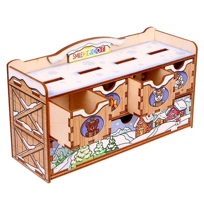 - Игра «Сортировка». Предварительно вставьте верхние выдвижные ящички в комодик, повернув их стороной с изображением персонажей к ребёнку. Предложите разместить зверят и снеговиков в соответствующие ящички, опуская фигурки по одной в прорези сверху.