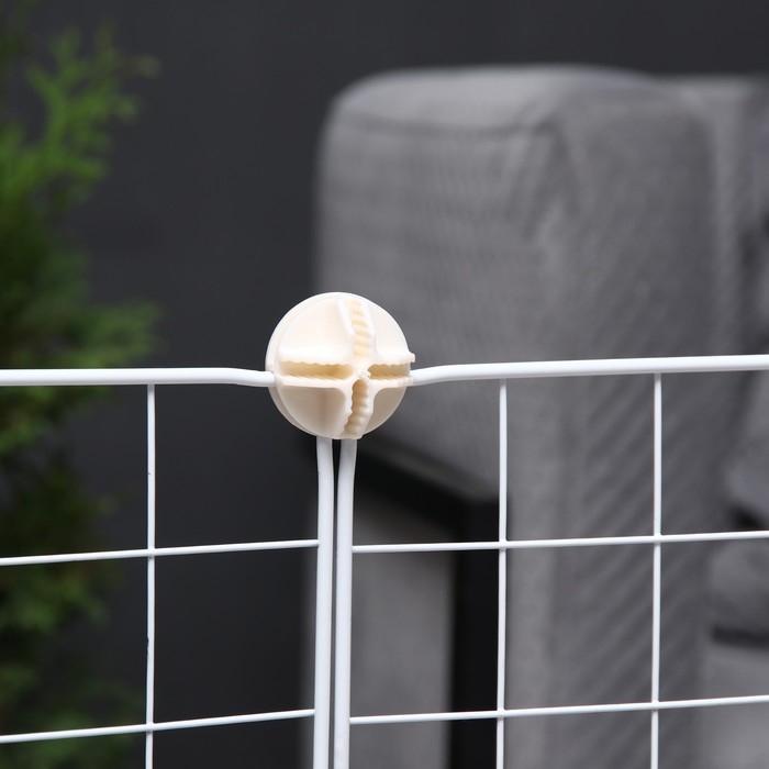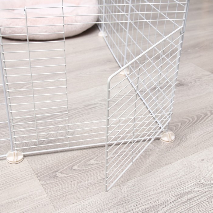 Вольер (клетка) сделан из негнущихся металлических секций, его можно быстро собрать и разобрать на открытом воздухе или в квартире без каких-либо дополнительных инструментов. Съемная конструкция складных перегородок разборного домика позволяет формировать квадратную, прямоугольную или любую неправильную форму.
