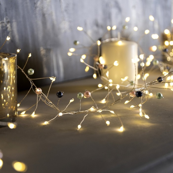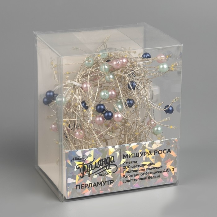 Гирлянда «Мишура» 2 м роса с насадками «Перламутр», IP20, серебристая нить, 200 LED, батарейки ААх3 (нет в комплекте), свечение тёплое белое