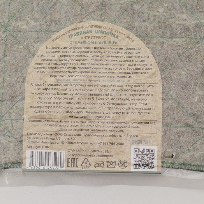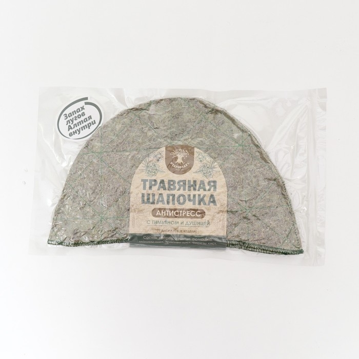 В шапочку антистресс входят растения богатые эфирными маслами, которые хорошо известны своим благотворным действием на нервную систему. Тимьян стимулирует защитные силы организма, мята успокаивает нервную систему, душица снижает аппетит и стимулирует сон. Под воздействием горячего пара и воздуха в шапочке образуется отвар, проникающий в кожу головы. Березовый лист и крапива способствуют укреплению волосяных луковиц, борются с перхотью, делают волосы мягкими и шелковистыми. Травяная шапочка - предмет личной гигиены!