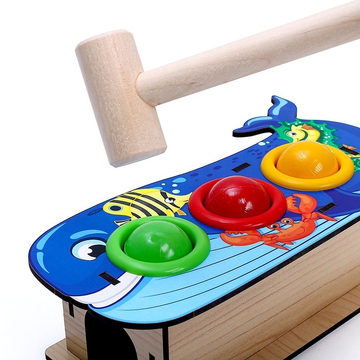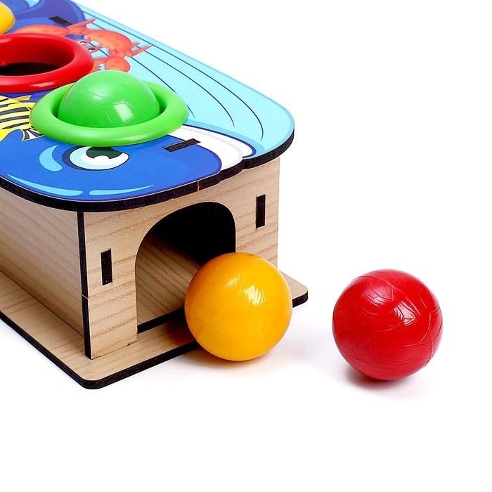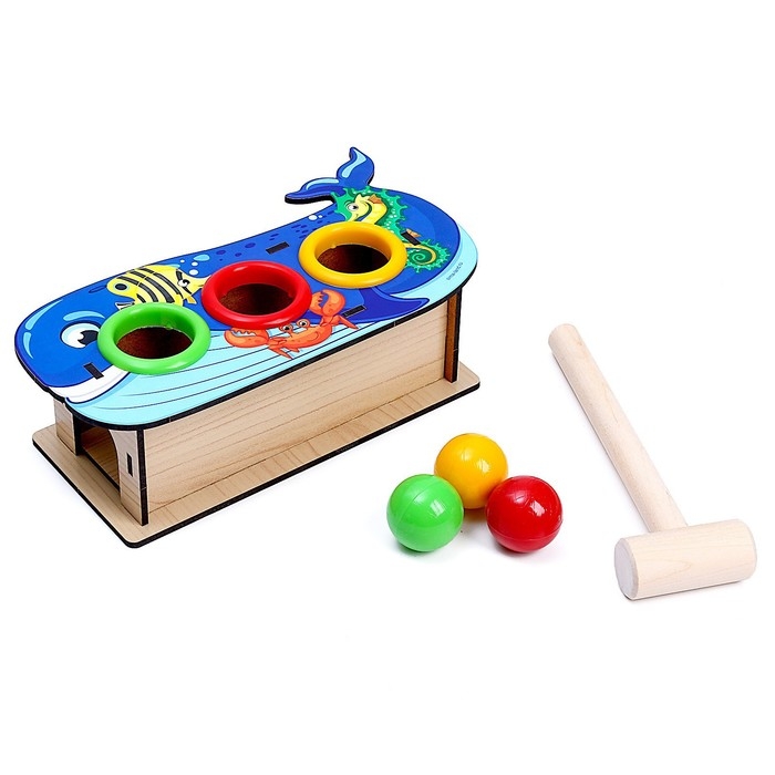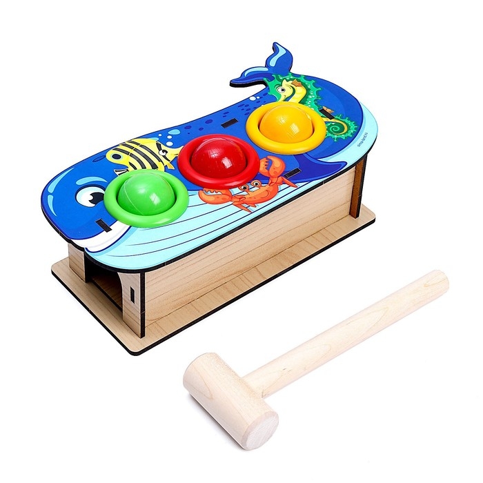 Юный испытатель берет в руки деревянный молоток, который входит в комплект, и забивает им шарик в отверстие. Когда достигнута цель, и круглый элемент попал в лунку, он выкатывается из коробочки! То же самое проделывается с остальными тремя шарами. Такое увлекательное и захватывающее занятие развивает у малышей мелкую моторику, координацию движений и целеустремленность, а также тренирует мышцы рук.