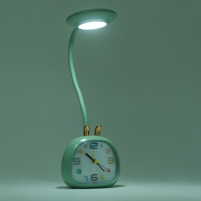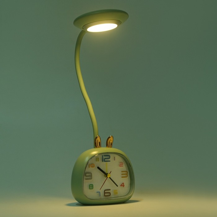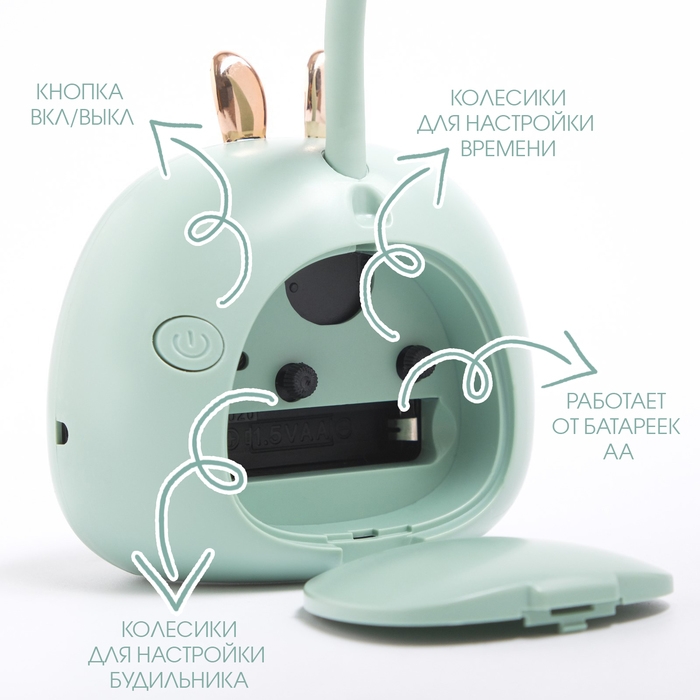 Часы будильник настольные с подсветкой представлены в ярком дизайне в форме зайца, они отлично впишутся в ваш интерьер. Интерьерные часы со светильником станут прекрасным декором для дома и дачи, их можно поставить как на прикроватную тумбочку в спальне, детской комнате, гостиной так и на стол или на комод в зале, холле или на кухне. Особенностью данного настольного будильника является наличие подсветки. На циферблате изображены яркие разноцветные арабские цифры и три стрелки, легко читаются, по ним ребенку будет удобно учиться определять время. Часы можно использовать в качестве ночника или офисной лампы на столе школьника. На задней панели помимо отсека для батарейки типа АА (в комплект не входит) находятся переключатель включения/выключения будильника, колесики чтобы настроить текущее время и время пробуждения, а также кнопка для включения/выключения подсветки.