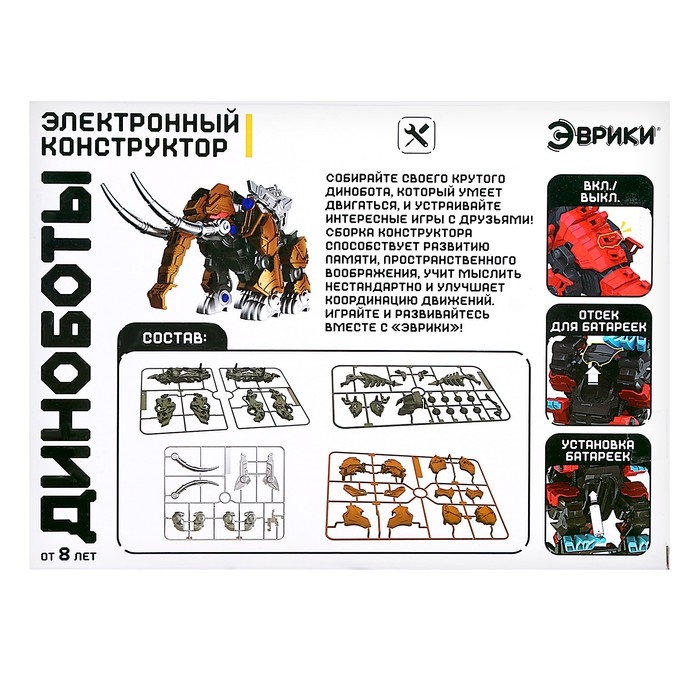 С электронным конструктором ребёнок соберёт могучего мамонта и освоит основы робототехники. Набор объединяет сразу три игрушки: конструктор, животное и робота. Конструктор понравится любителям собирать модели и оживлять их. Ведь динобот оснащён электродвигателем, а внушительный внешний вид древней рептилии никого не оставит равнодушным!