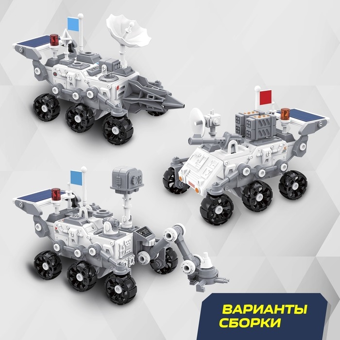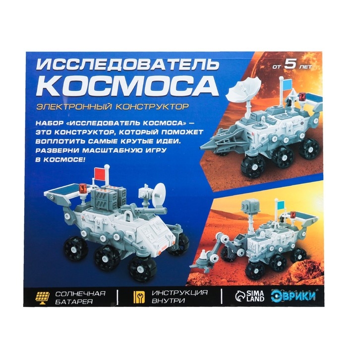 С электронным конструктором юный космонавт соберёт одну их трёх машин и станет исследователем межгалактических пространств! Собранная модель работает от солнечной батареи. Ребёнок сможет играть на свежем воздухе и дома. Для игры на улицы подойдёт солнечная ясная погода, а чтобы играть дома, используйте искусственный источник освещения.