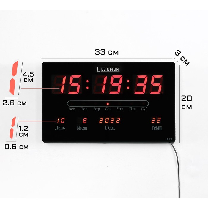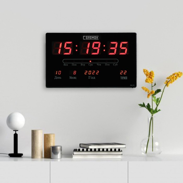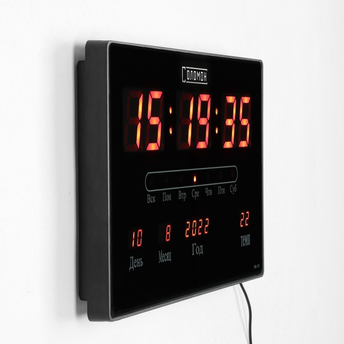 Часы электронные настенные, будильник, календарь, термометр, 20 х 3 х 33 см, красные