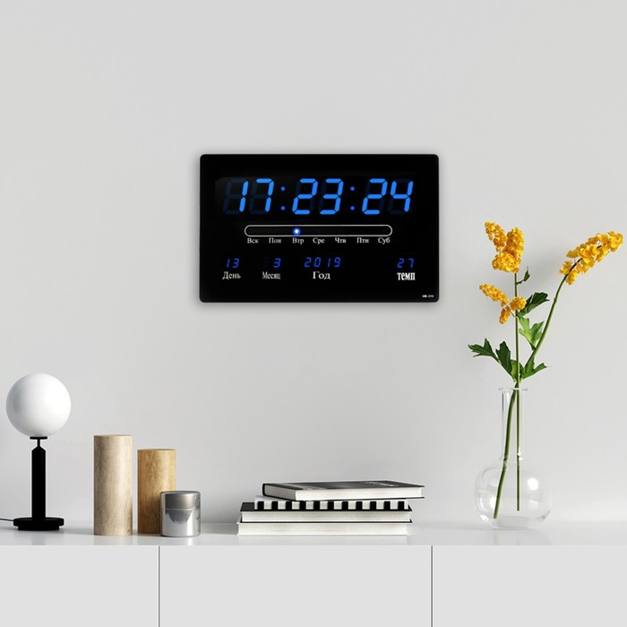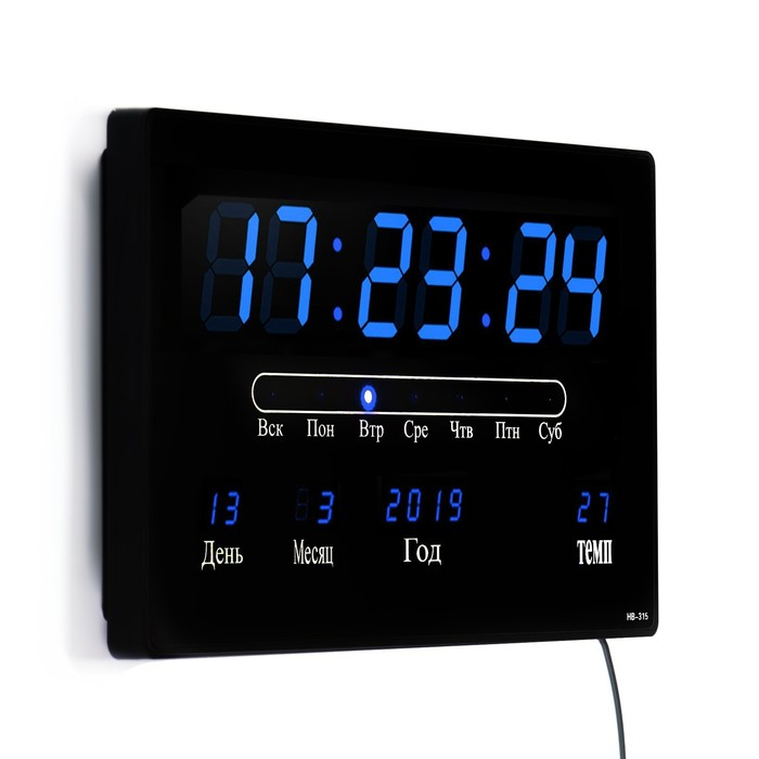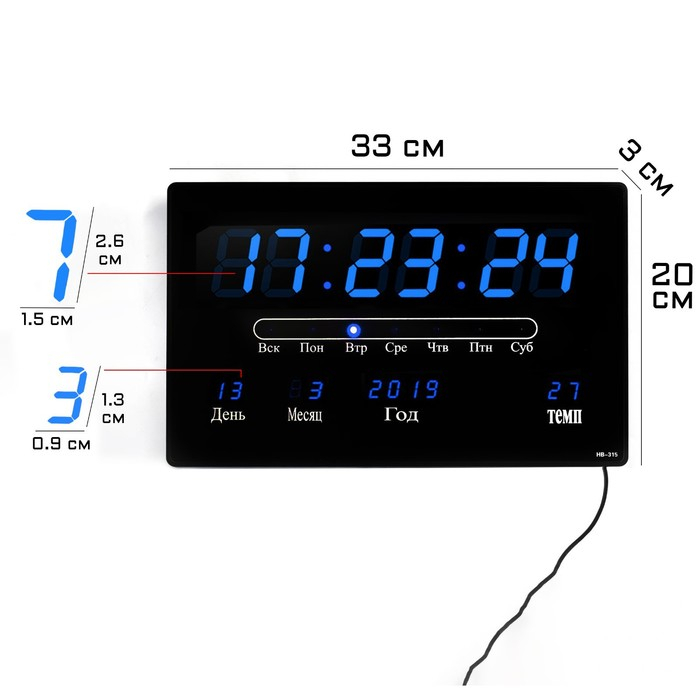 Часы электронные настенные, будильник, календарь, термометр, 20 х 3 х 33 см, от сети, синие