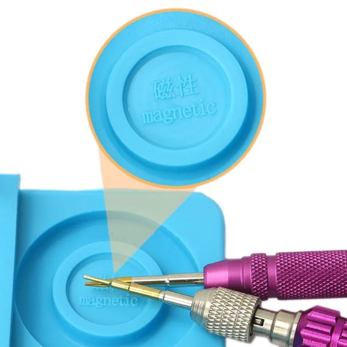 На коврике есть отсеки для размещения инструментов, хранения мелких деталей и специальные отсеки с магнитным основанием для фиксации винтов.