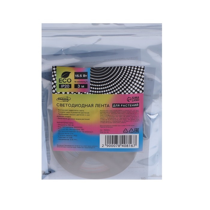 Фитолента светодиодная Luazon, 5 В, SMD5050, 3 м, IP20, 10.3Вт, 60 LED/м, USB, мультиспектр.