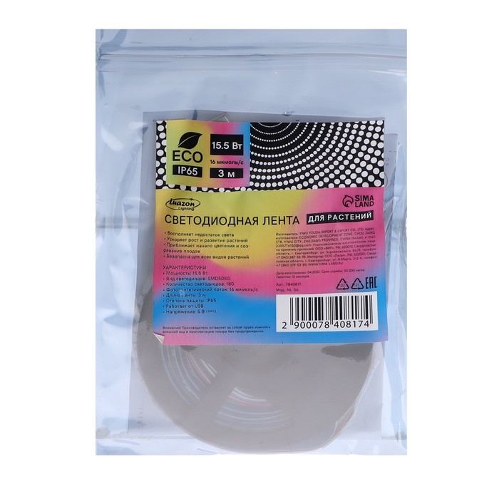 Фитолента светодиодная Luazon, 5 В, SMD5050, 3 м, IP65, 10.3Вт, 60 LED/м, USB, мультиспектр.