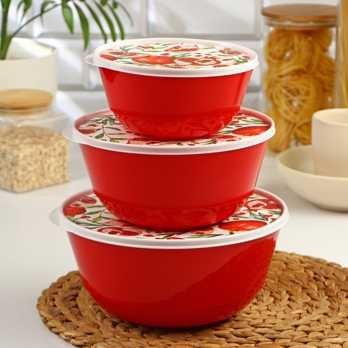 Набор мисок с крышкой «Гранат», 3 шт: 1 л, 2 л, 3 л, цвет красный