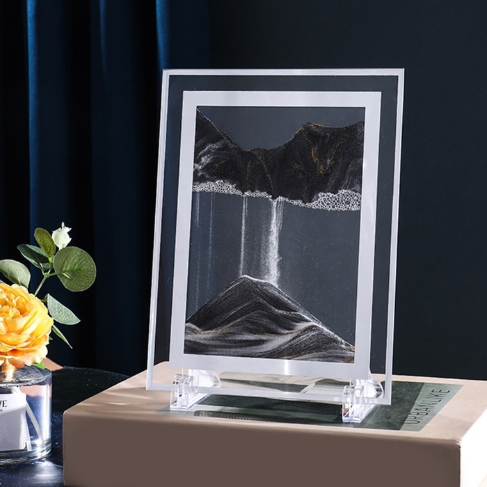 Вы воздействуете одним прикосновением, когда рамка переворачивается, песок начинает произвольно струиться вниз, огибая пузырьки жидкости, образуя удивительной красоты пейзажи. Наблюдение за этим процессом позволяет человеку расслабиться, отдохнуть, успокоить нервы.