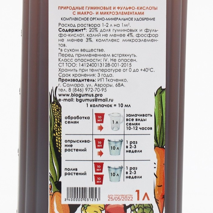 Массовая доля гуминовых и фульвовых кислот (в пересчете на сухое вещество): не менее 20%.
