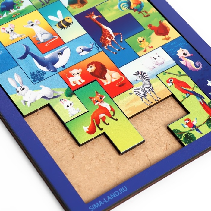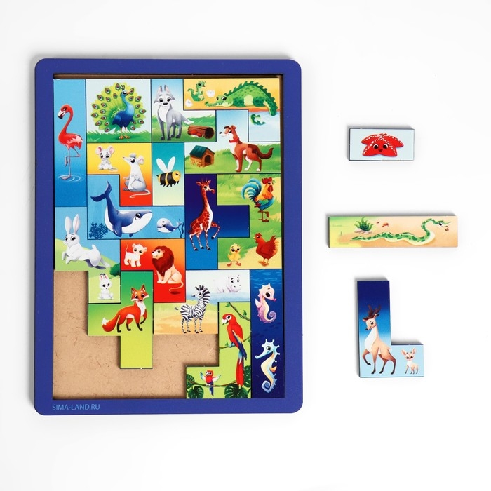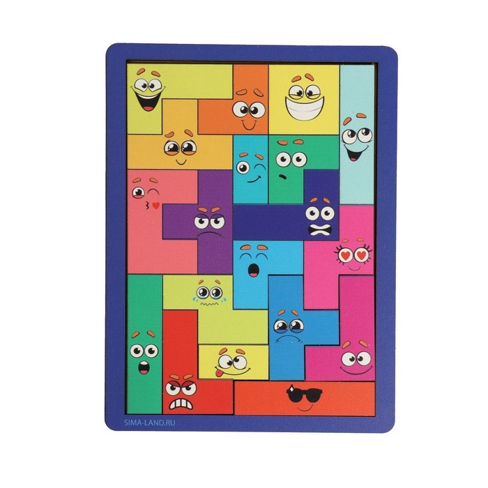 - Смысл игры — заполнить пустое пространство в деревянной основе фигурами разных форм и цветов.