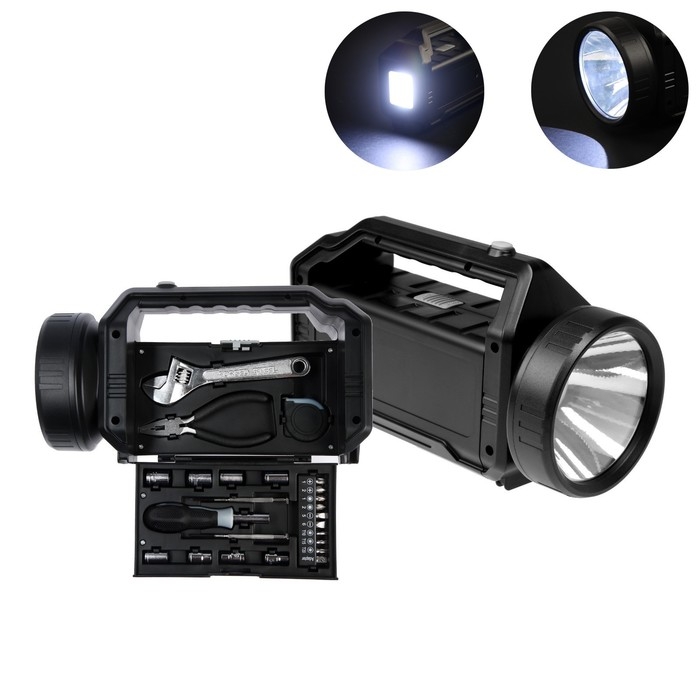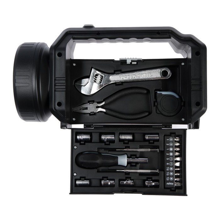 Плоскогубцы, Разводной ключ, Рулетка, Торцевые головки биты, Фонарь