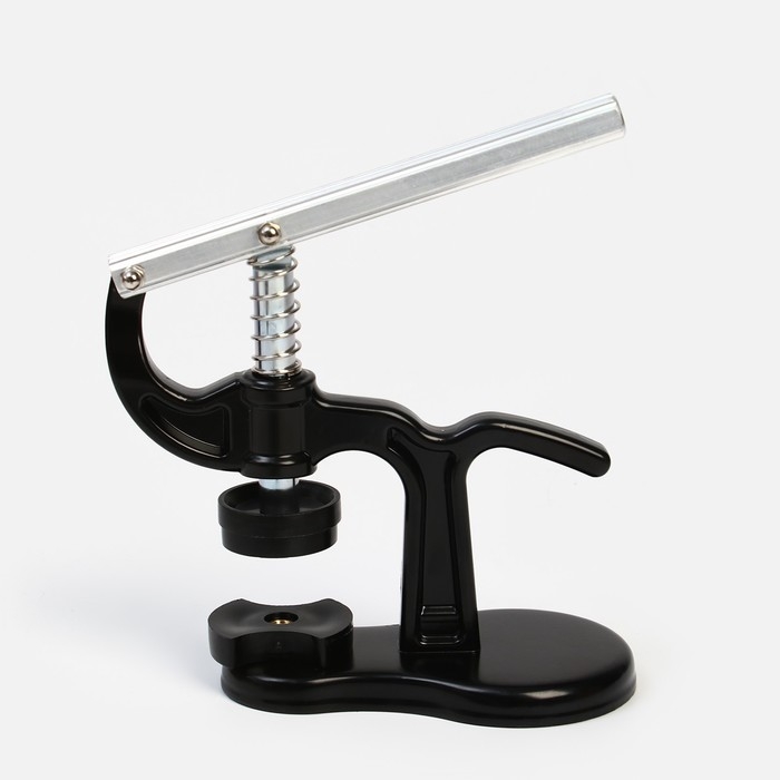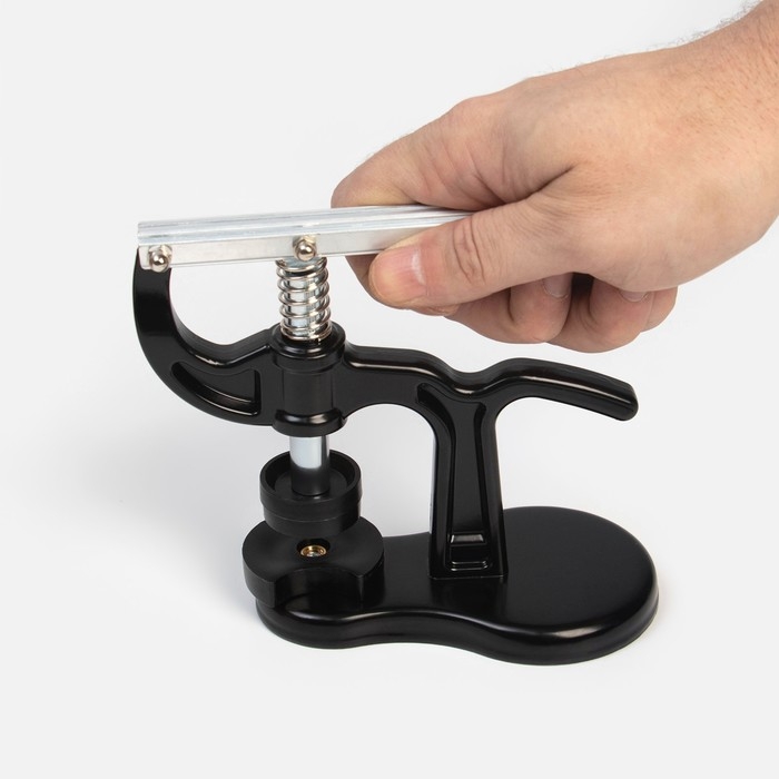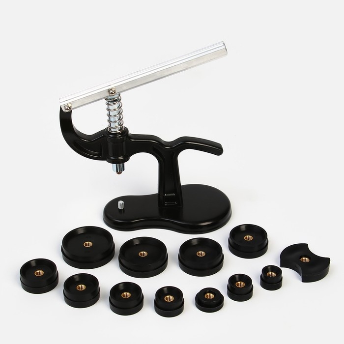 Пресс для замены задней крышки часов. В комплекте 12 винтовых фторопластовых насадок разного размера (18 - 50 мм), что позволяет использовать пресс с часами любого размера и формы.