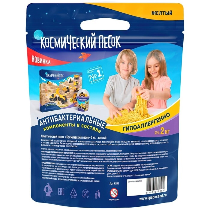 Космический песок — это инновационный материал для творчества и игр. Он похож на обычный влажный песок, но в то же время он абсолютно сухой. Песок легко рассыпается в руках, оставляя ладони сухими и чистыми. Хорошо сохраняет форму во время лепки.