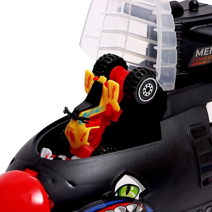 - В носовой части лодки откройте прозрачную и красную крышки, и вы получите доступ к спуску, по которому можно скатывать квадроциклы.