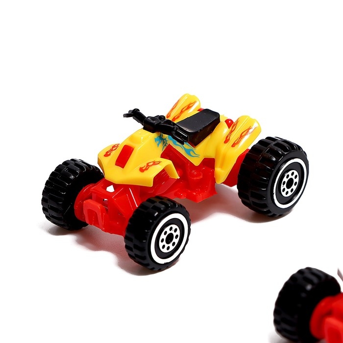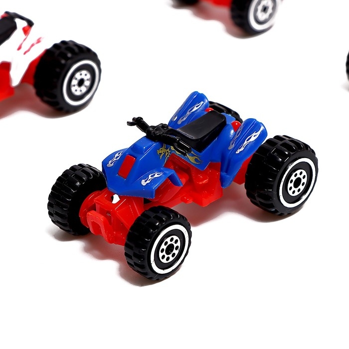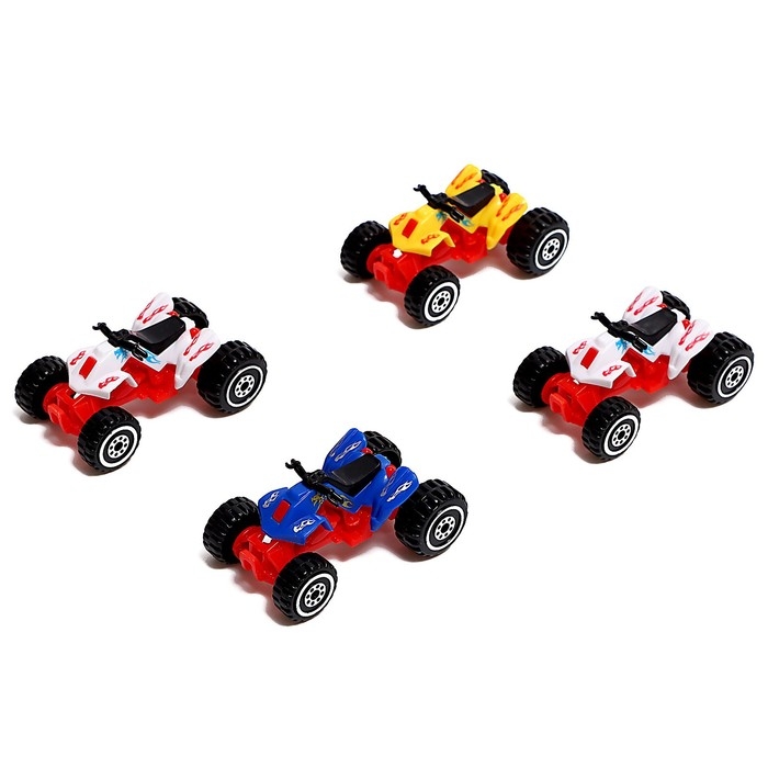 - В комплекте 4 квадроцикла. Размер каждого: 7 × 2,8 × 2 см.