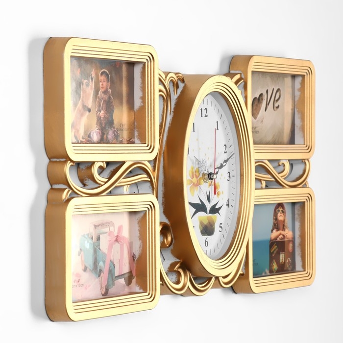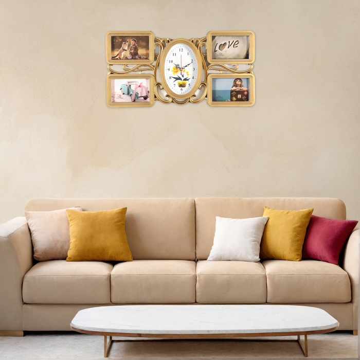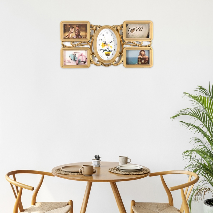 Настенные часы с фоторамками - оригинальный подарок, который никого не оставит равнодушным. Эти часы настоящая находка для тех, кто ценит качество и неповторимый дизайн. Настенные часы - это не только функциональный предмет, но и настоящий декоративный аксессуар, они разнообразят интерьер любой спальни или гостиной, подчеркнут стиль и гармонию вашего дома. Вместе с часами идут 4 рамки для фотографий, сделайте подборку из лучших и любимых фотографий, которые будут напоминать вам о каком-то приятном моменте вашей жизни.