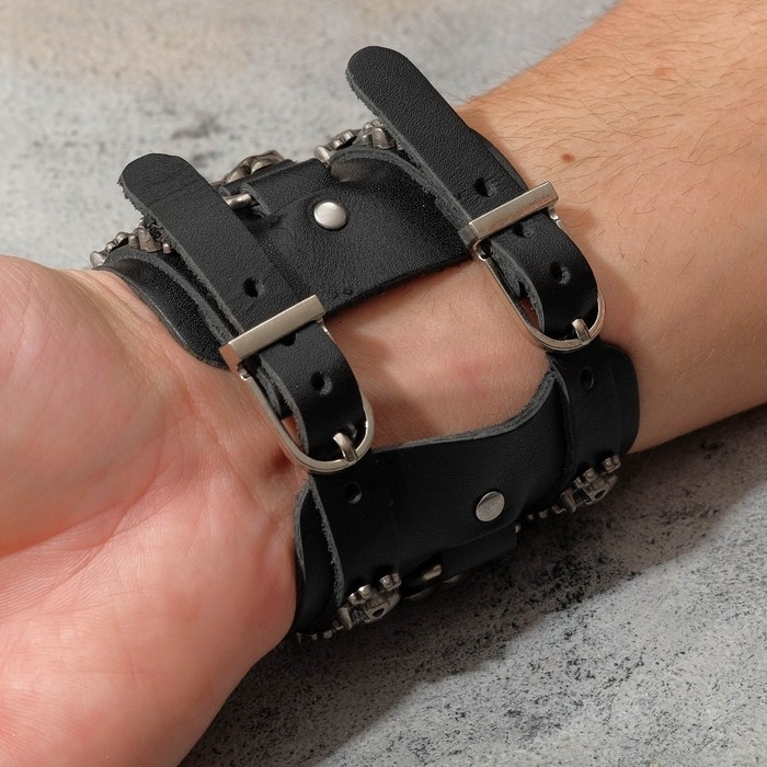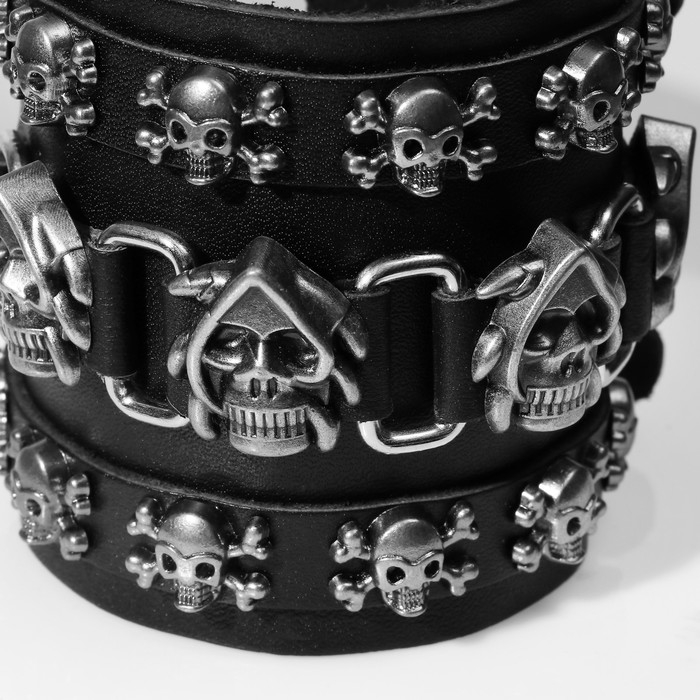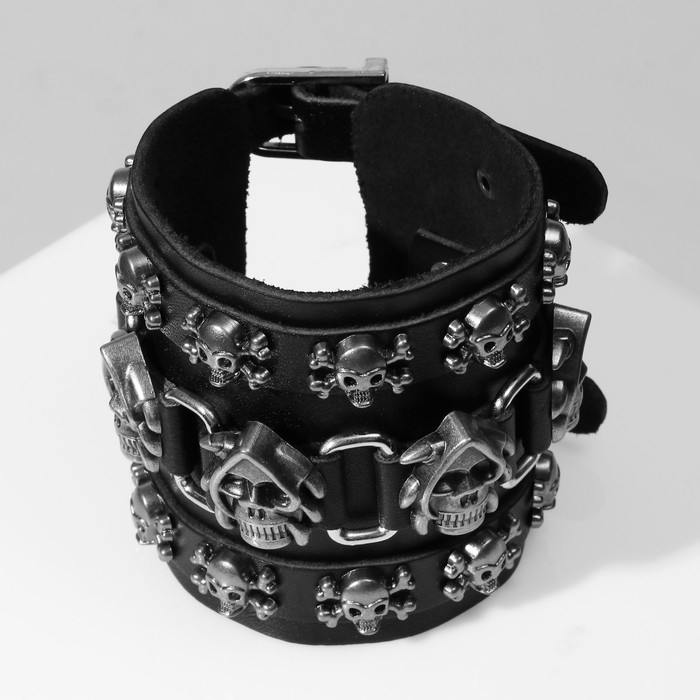 Браслет кожа «Череп» широкий, цвет чёрный с серебром, 26,5 см