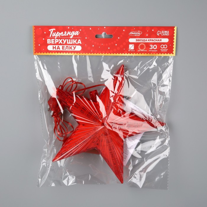 Светодиодная верхушка на ёлку «Звезда красная» 22 см, 30 LED, провод 2 метра, 220 В, свечение красное