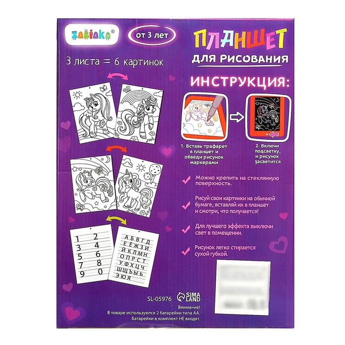 Планшет для рисования «Волшебный единорог», 6 неоновых фломастеров, 6 картинок, 8 световых эффектов