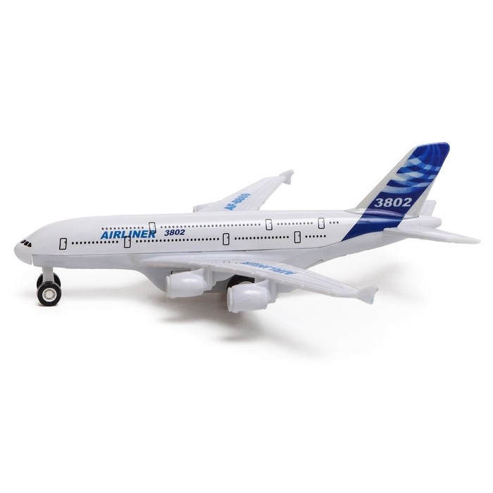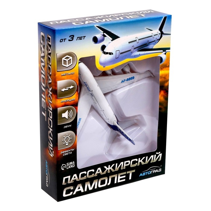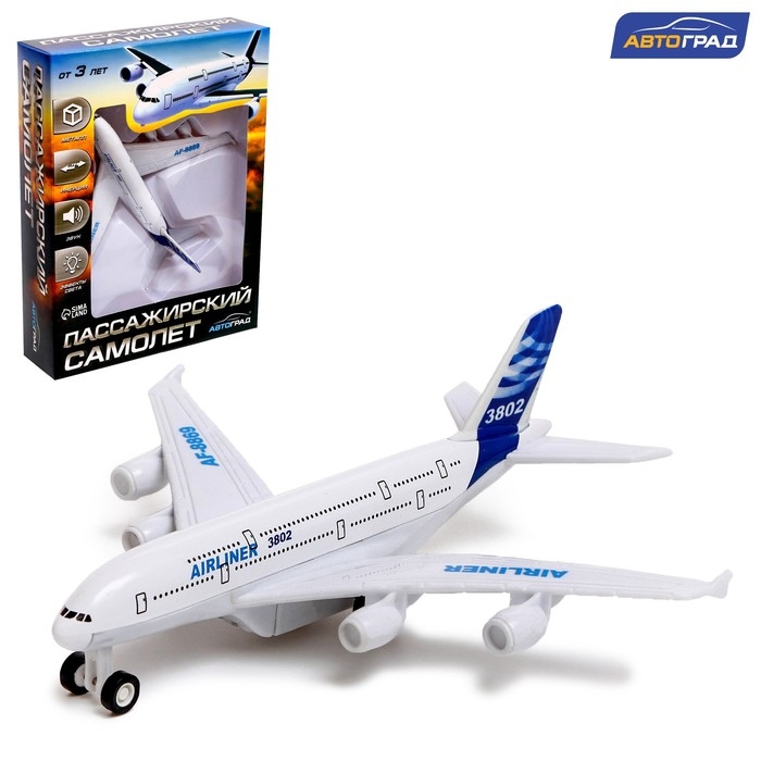 Самолёт металлический «Пассажирский», инерционный, световые и звуковые эффекты, цвет бело-синий