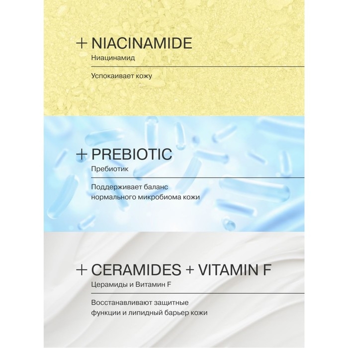 Уменьшает покраснение кожи и повышает уровень увлажненности, сохраняющийся 48 часов*. Активные ингредиенты восстанавливают гидролипидный барьер, устраняя чувство стянутости и зуд от сухости, уменьшают шелушение. Благодаря входящему в состав пребиотику регулирует и поддерживает баланс нормального микробиома кожи, способствуя восстановлению ее защитной функции. Содержит физиоадаптированную воду, которая обеспечивает высокую совместимость средства с кожей.