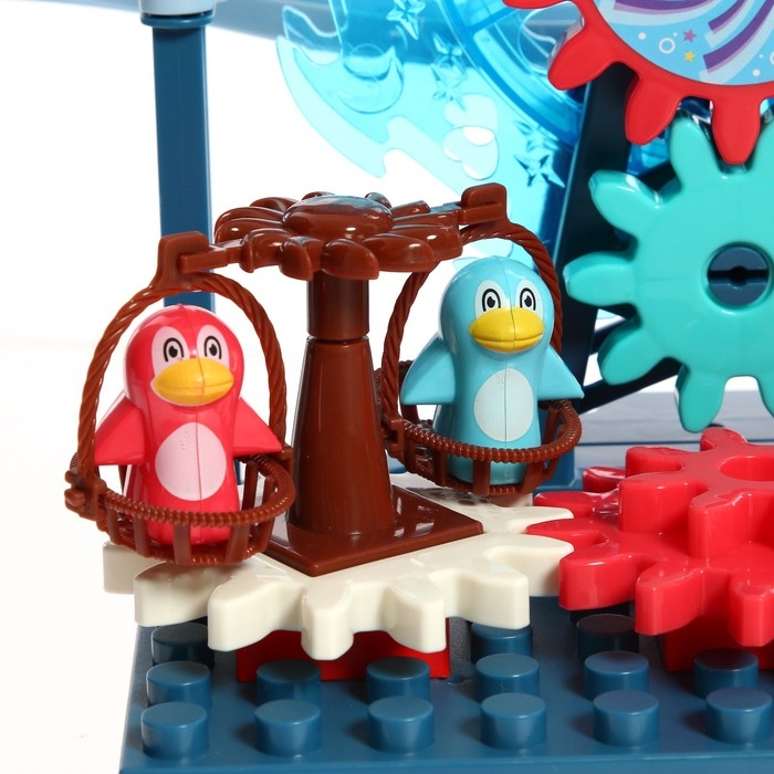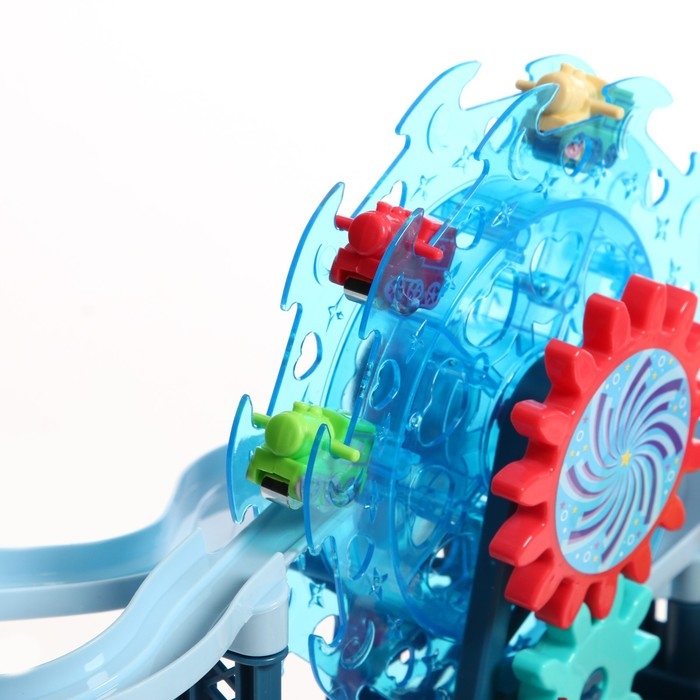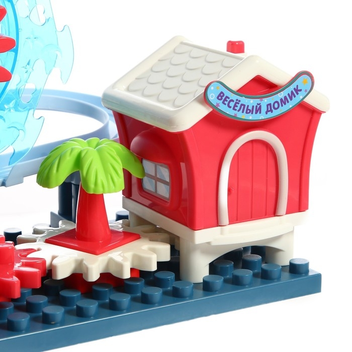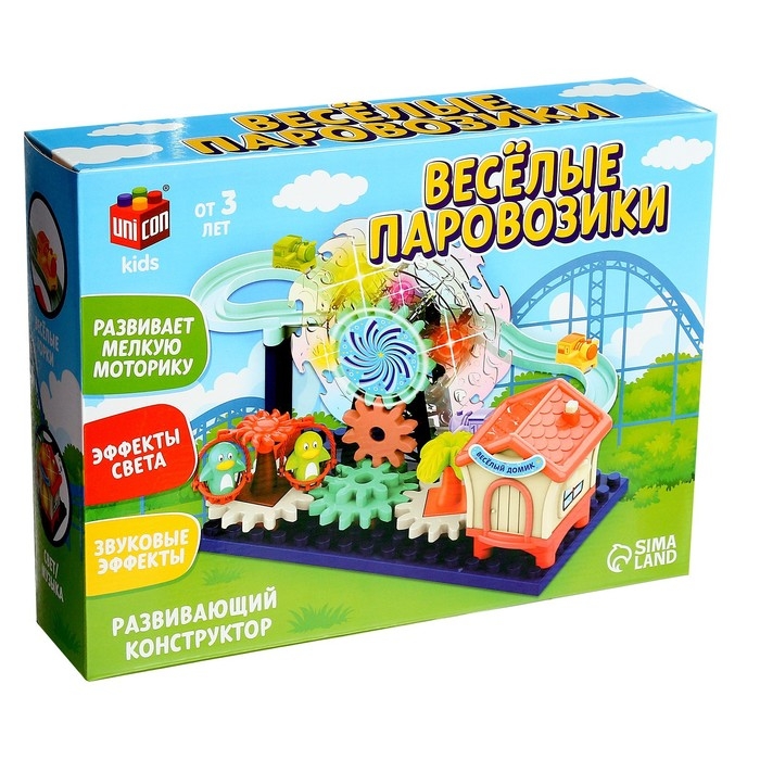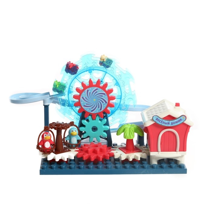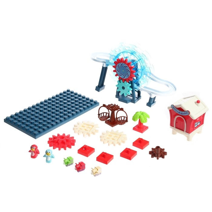 Развивающий конструктор с шестерёнками — увлекательный парк аттракционов, с дорогой, по которой катаются маленькие паровозики. Небольшой парк развлечений двигается за счёт вращения шестерёнок.