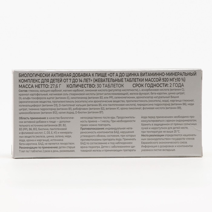 ОТ А ДО ЦИНКА ВИТАМИННО-МИНЕРАЛЬНЫЙ КОМПЛЕКС ДЛЯ ДЕТЕЙ ОТ 7 ДО 14ЛЕТ - Биологически активная добавка (БАД) к пище - сбалансированный состав биологически активной добавки к пище обеспечивает получение организмом как необходимых макро- и микроэлементов, так и комплекса витаминов.