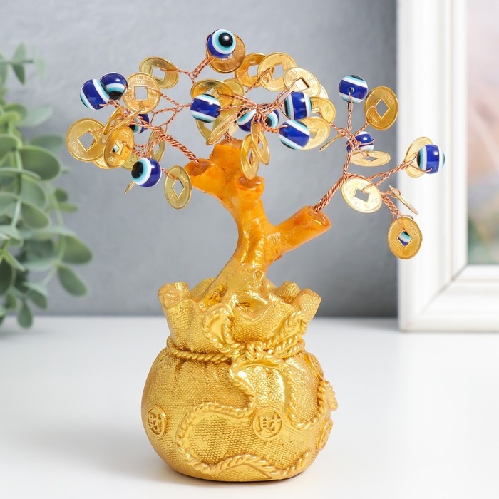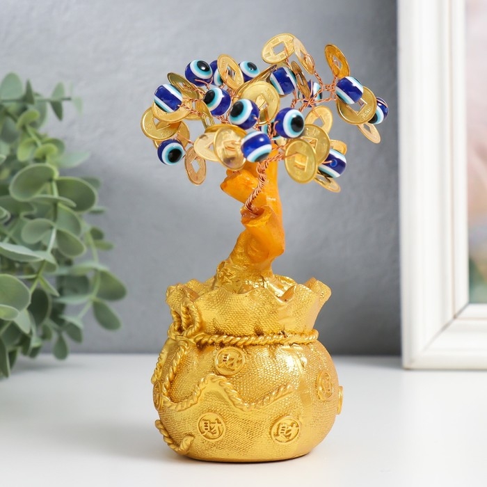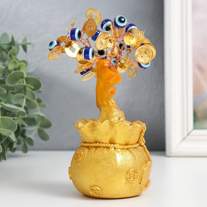 Сувенир бонсай "Денежное дерево в золотом мешке" 16 глазиков, 32 монеты 15х6,5х6 см
