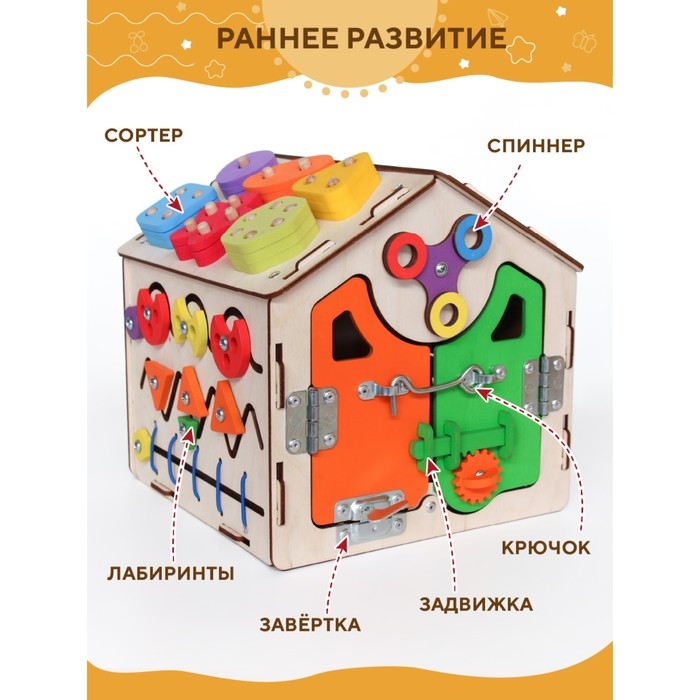 - Развивающие элементы: сортер с геометрическими фигурами, пазл «Паровозик», распашные дверцы, спиннер, музыкальный барабан, тематический световой блок «Светофор», лабиринты, шестеренки с бисером, часы.