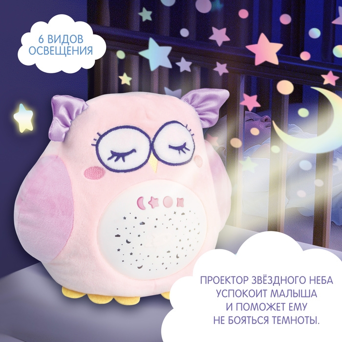 Включите игрушку, и у вас появится проекция звёздного неба. Используйте ночник перед сном — приятная мелодия поможет убаюкать малыша.