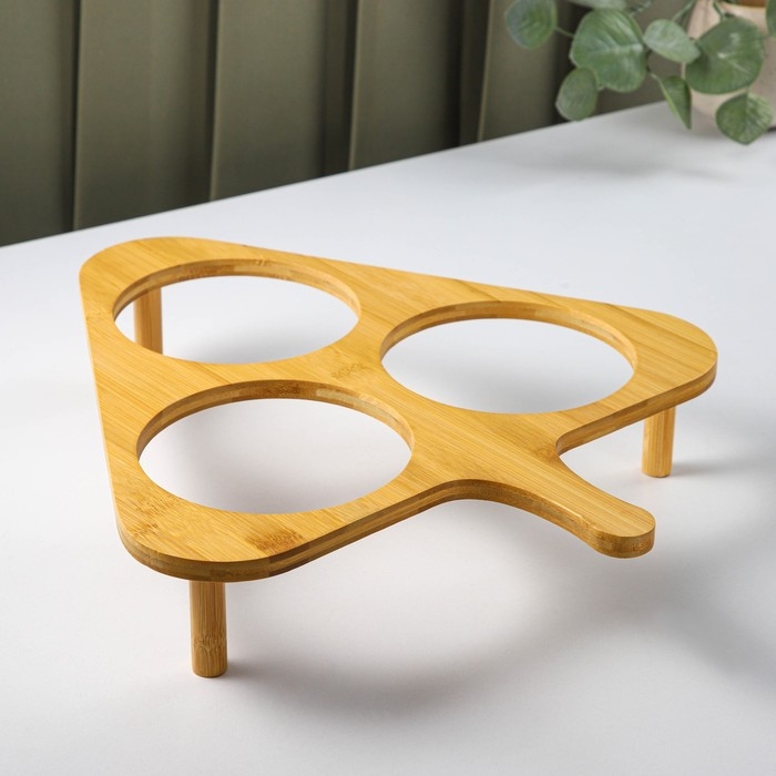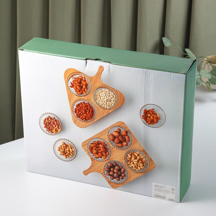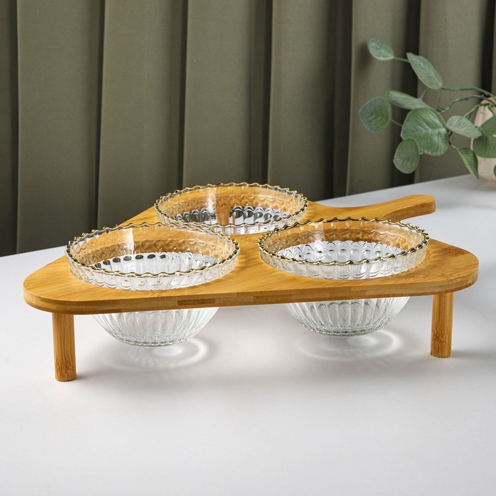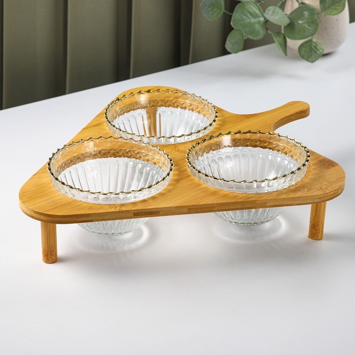 Набор для подачи состоит из трёх стеклянных ёмкостей и бамбуковой подставки. Такой набор позволит вам разместить сразу несколько блюд, предназначен для сервировки стола, а также подойдет под любой интерьер. Прекрасно подходит для подачи десертов, фруктов и благодаря необычному дизайну украсит любой стол.