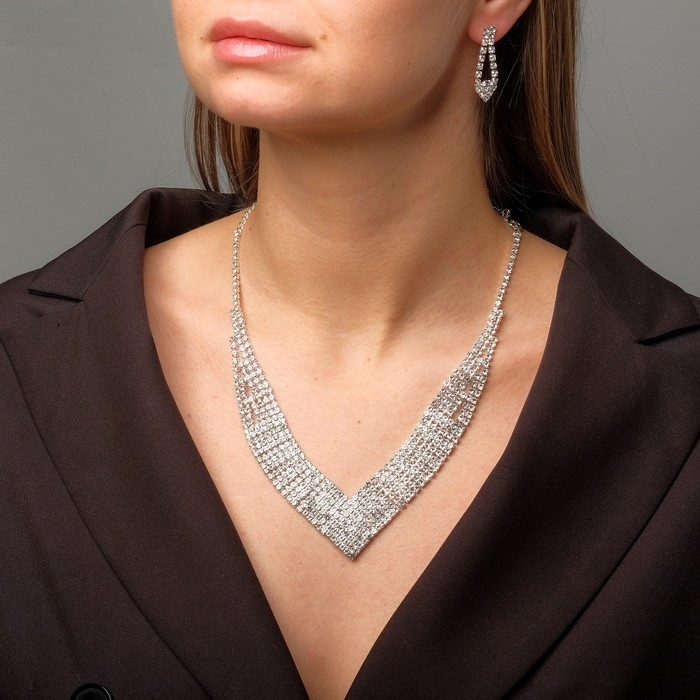 Набор 2 предмета: серьги, колье «Искры» уголком, цвет белый в серебре, 30 см